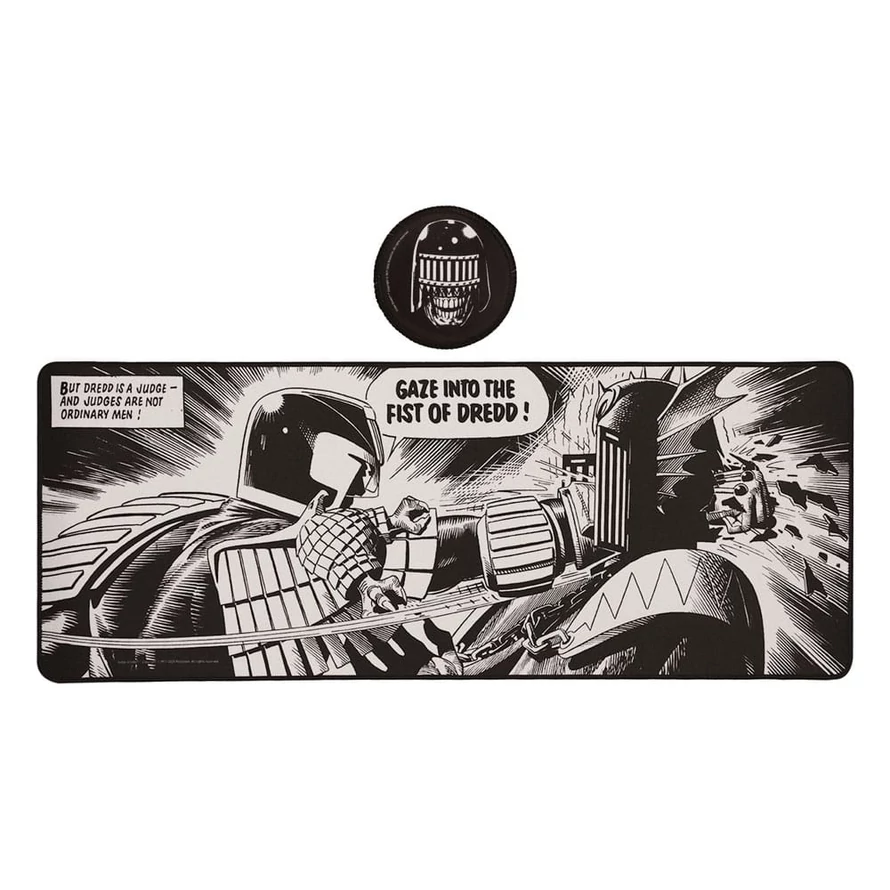 """Dredd is a Judge - and Judges are not ordinary men! "" Never a truer word said, as Dredd punched Judge Fear so powerfully his fist broke through the back of Fear's helmet! This panel, taken from 2000 AD Prog 227 published in 1981, is one of the most iconic images in comics history, part of the influential Dark Judges storyline. Topped with micro-textured fabric with reinforced edges and non-slip rubber base, this Judge Dredd desk pad measures 800x300x3mm and the non-slip coaster (which is made of the same material and depicts Judge Death) measures 100mm in diameter. - Officially licensed - Reinforced edges - Non-slip base - Desk pad - 800x300x3mm - Coaster - 100mm diameter"