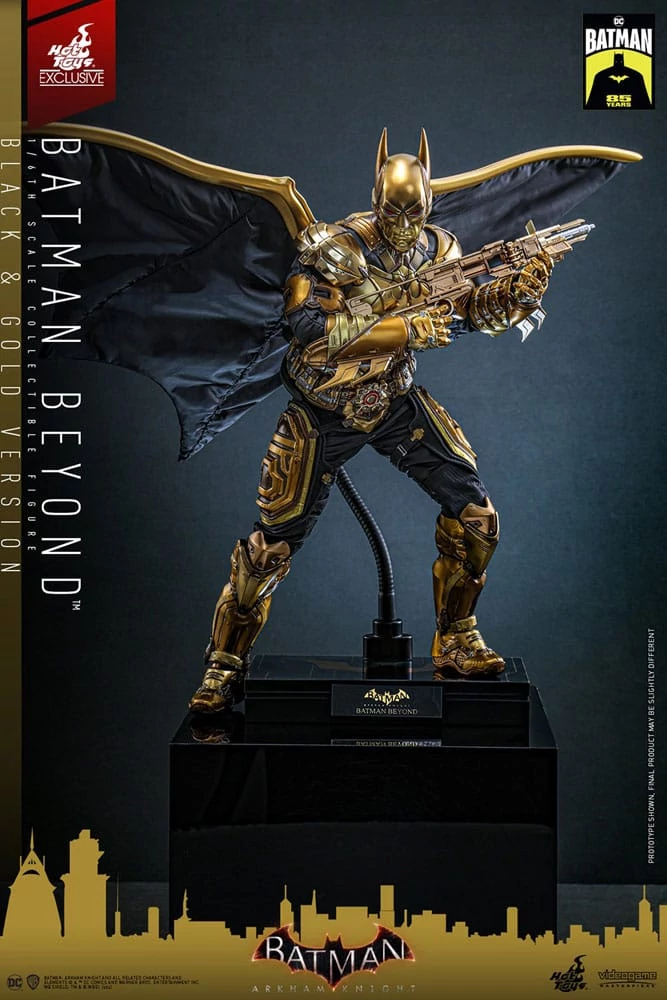Every Batman fan should have a solid collection of Batman in their display cabinet. And the Batman: Beyond suit, considered one of the most spectacular suits among fans, is one essential Batsuit for gamers to collect in Batman: Arkham Knight, featuring a futuristic tactical look. In celebration of Batman Day 2024 and the 85th anniversary of Batman's debut, Hot Toys is thrilled to present the Batman Beyond suit as a sixth-scale collectible figure with a new Black & Gold color combination. It's an exclusive figure with limited quantity of 2,000 units available only in selected markets. Based on the Batman Beyond suit appeared in Batman: Arkham Knight, the collectible figure is reimagined with a new colorway. Commanding fans attention with exceptional color combination of black and gold, the figure is beautifully painted with different shades of gold and is elaborated by details of keeping the original color of red in the eyes. The black color under the gold in the meantime highlights the complex armor pieces, adding a tactical touch from the original Batman Beyond suit. It also features a newly painted cowled head with two interchangeable lower faces; a newly painted Batsuit in metallic gold with weathering effect; bat symbol on chest plated by gold chrome; a carefully tailored batcape for dynamic flying poses; detailed Batman's gadgets including Batman Beyond style Batarang, grapnel, disruptor, REC gun, freeze grenade and a figure stand. Celebrating Batman Day 2024 and the 85th anniversary of Batman? This is your chance to start your Batman figure collecting journey with our new Black & Gold version of Batman Beyond collectible figure!