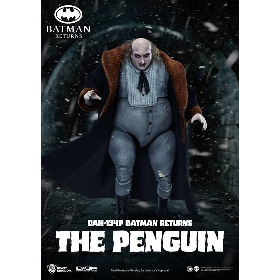 In Batman Returns, Danny DeVito's portrayal of the Penguin, Oswald Cobblepot, is one of cinema's most iconic villains. As Gotham City's criminal mastermind, the Penguin combines intelligence and strategy with a tragic backstory and desire for acceptance, making him one of Batman's most compelling foes. To honor this character, Beast Kingdom proudly presents the latest addition to its DAH series, DAH-134P Batman Returns The Penguin. This figure faithfully captures the Penguin's dark look from the film. The head sculpt highlights the facial details, rooted hair creates his messy locks, and the skin texture reflects his unique expression. The body replicates his rounded physique and signature gray suit. The coat, made of quality fabric, includes brown velvet-like accents on the collar and cuffs, with interior details like lining and pockets. This figure has 18 points of articulation and includes interchangeable hands, along with the signature umbrella, mini weaponized penguin, bucket, fish, and an extra set of hands. Limited to 3,000 sets worldwide, with a collector's certificate., this is a must-have for Penguin fans. This Penguin series brings the characters from Batman Returns to life and is essential for any Batman collection. Head to Beast Kingdom's official store or authorized retailers to pre-order these exclusive collectibles! - Head sculpt based on Danny DeVito's facial contours and expression - Realistic rooted hair replicating the Penguin's look - Specially designed rounded body with 18 points of articulation - Hands: holding hands x1 pair, open hands x1 pair - Velvet-like fabric coat - Accessories: bucket, fish, umbrella, mini weaponized penguin - Limited to 3,000 sets worldwide, with a collector's certificate.