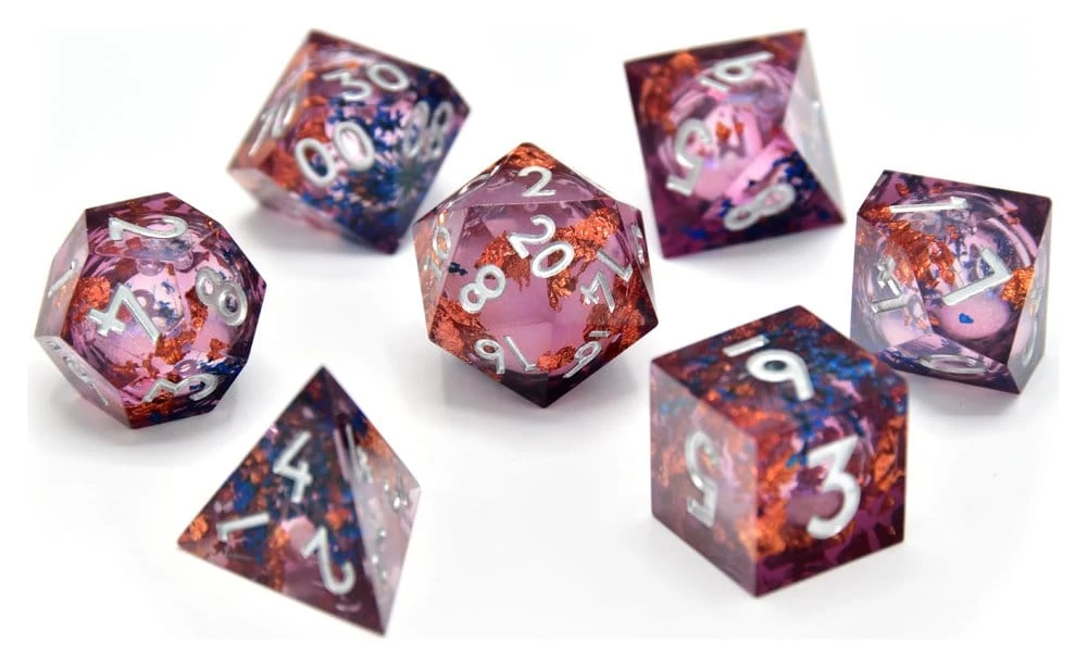These RPG dice are made from high quality resin and have sharp edges. Inside each die is a liquid core that gives their distinct snow globe effect! This means that when these dice are rolled, the fluid inside will swirl and the particles inside will glitter and sparkle. You can be sure you will wow anyone when rolling these sparkly dice! Made from premium resin, these dice are casted by hand and have sharp edges. Inside they have a liquid fluid core with sparkling particles in them. This set includes all standard polyhedral dice - d4, d6, d8, d10, d12, d20, and a percentile die (d10 marked in tens) Contains: 7 dice