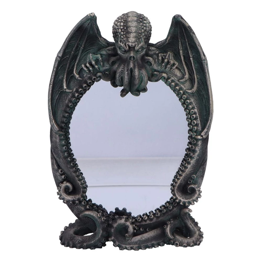 "Unveil the essence of gothic horror with Cthulhu's Reflection, a unique mirror that melds eldritch mythology with macabre elegance. This striking piece features a central mirror, encircled by a detailed Cthulhu figure, whose menacing visage peers over the reflective surface. The intricate design includes ominous wings extending from its back and long, sinuous tentacles that elegantly support the mirror, ensuring it stands upright in a truly chilling manner. Crafted for collectors and aficionados of gothic and horror décor, Cthulhu's Reflection adds an unmistakable touch of the supernatural to any space. The mirror's dark and alluring design not only serves as a functional item but also as a captivating conversation piece, perfect for those who revel in the eerie and the arcane. Each mirror is encased in a protective polystyrene cover and placed in a sturdy brown box to ensure it arrives in pristine condition. Elevate your collection with Cthulhu's Reflection, where gothic craftsmanship meets the chilling allure of cosmic horror. Ideal for display in a haunted study, gothic parlor, or any space yearning for a touch of the macabre, this mirror is a must-have for those who embrace the darker side of décor." Size: 25 x 17 x 8 cm