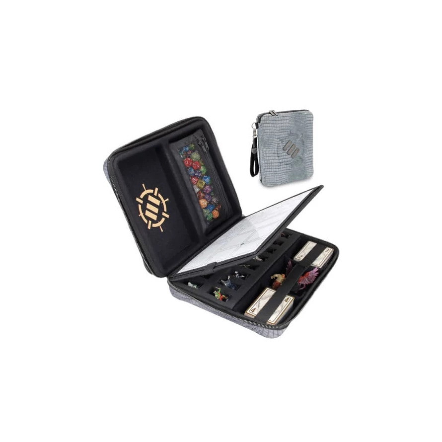 ENHANCE Tabletop RPG Organizer Case Collector's Edition. Upgraded with the power of Dragon Scales, along with a collectible metal charm keychain and holographic sticker to mark the exclusivity of your Collector's Edition DnD Binder. An all-in-one storage case for RPG players. Features a unique binder design with custom compartments for dice, miniatures, class ability cards, and more. Also features two sides, each with various compartments. The left side has a large dice rolling tray, a removable pencil/accessory pouch, and a spare document compartment behind the dice tray area. The right side is a foam tray with 16 slots for miniature figures and a modular section for storing cards, dice, and other accessories. In the center is a divider with a transparent panel to store and protect a character sheet; players can write directly onto the transparent panel with dry erase markers-a unique feature of the ENHANCE RPG Organizer Case. Figure tray: 16 slots; 1.97 x 0.98 x 0.98 inches each slot Interior Dimensions: 11.5 x 9.25 x 2.5 inches Exterior Dimensions: 12.75 x 10.3 x 3 inches