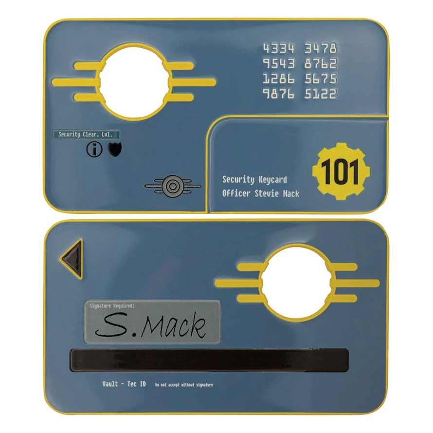 When the door to Vault 101 opens, the story begins..." Gain access to one of the most legendary vaults in Fallout history with this officially licensed Vault 101 Security Keycard Metal Replica. Inspired by the starting point of Fallout 3, this collectible is the ultimate nod to the vault where your Lone Wanderer's journey begins. Created with a double-sided design and made from metal, this authentic collectible is built to last longer than any Pip-Boy battery. Each card is individually numbered on the reverse, making every piece unique, and with only 5,000 worldwide, its rarity is like finding clean water in the Capital Wasteland! Measuring 110 x 62mm, this keycard is the perfect size to display in your Fallout collection, gaming shrine, or even alongside your Pip-Boy replicas. Supplied in collector's packaging, it's also supplied with an acrylic stand ready to show off right out of the vault. - Officially licensed - Limited to 5,000 - Individually numbered to reverse - Size 110 x 62mm - Display stand