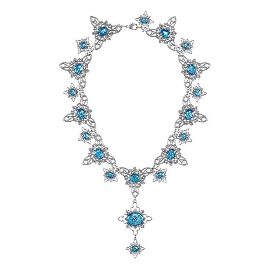 "Do not Touch! Cursed." This prop replica captures every chilling detail of the cursed opal necklace from Harry Potter and the Half-Blood Prince. Said to be terribly cursed, this necklace almost claimed the life of Hogwarts student Katie Bell. Complete with 20 iridescent blue stones and intricate aged silver metal embellishments, keep it safe or show it off with its 33 cm tall leatherette collector's display box, featuring metal swing clasps and lined with plush black velour fabric. The necklace is approximately 16 by 30cm with an adjustable clasp.