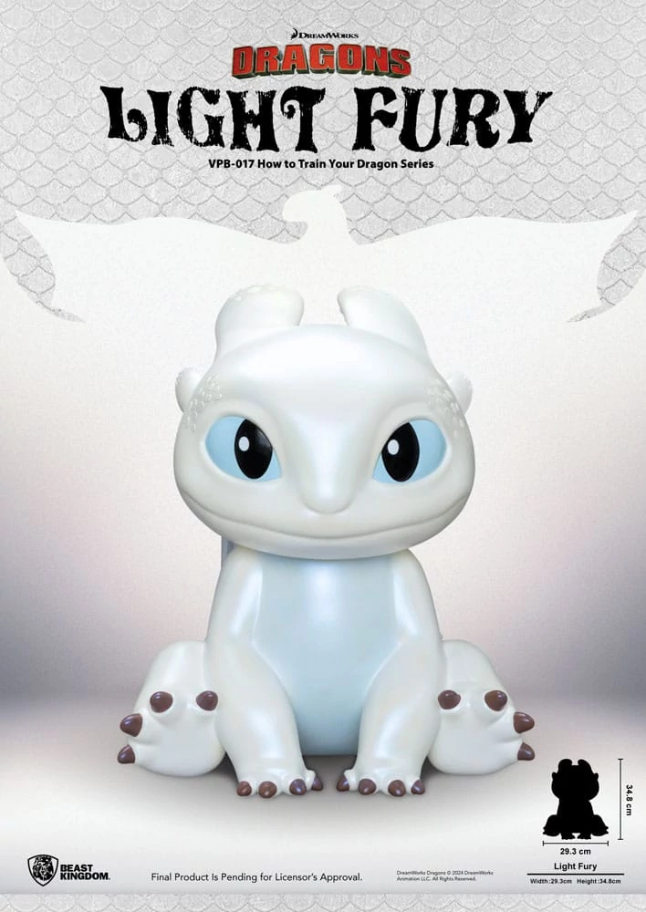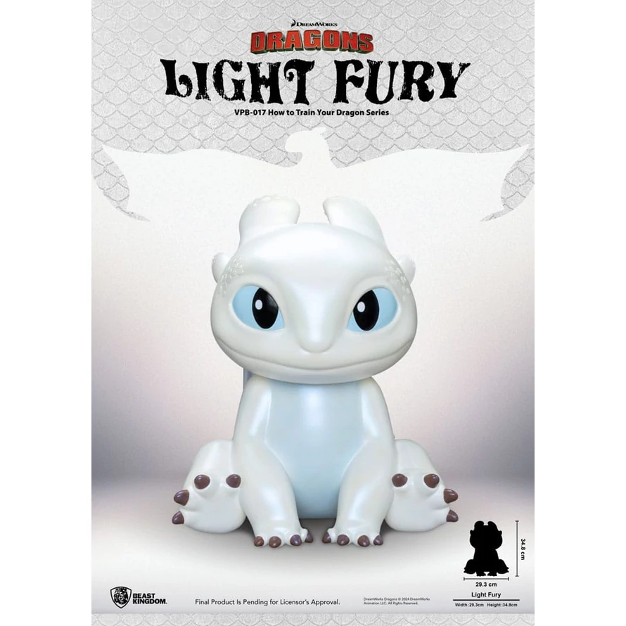She is Toothless's first love-the stunning white dragon named Light Fury. In "How to Train Your Dragon: The Hidden World," Light Fury has beautiful white scales and light blue eyes. Her charm and playful nature win Toothless over, and they start a family together. Following the "Toothless" vinyl piggy bank, Beast Kingdom now offers the "Light Fury" piggy bank. This new functional figurine features smooth scales and soft horn plates,. Her enchanting eyes and smile will make you want to save your money with her. Bring Light Fury home to be your saving companion!