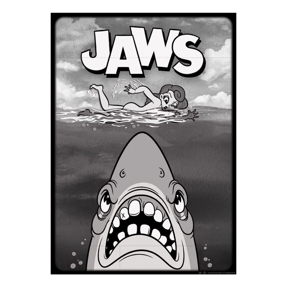 "The Jaws movie poster (and book cover) is one of the most famous of its kind. Designed by Roger Kastel for both the book and the film, it features a shark underwater swimming up to attack a woman swimming. This cartoon stylised version adds a playful touch to the design. Officially licensed, each A3 picture is limited to just 995 worldwide and is printed at one of the oldest printers in the UK. - Officially licensed - Limited to 995 - Individually numbered - 420 x 297mm"