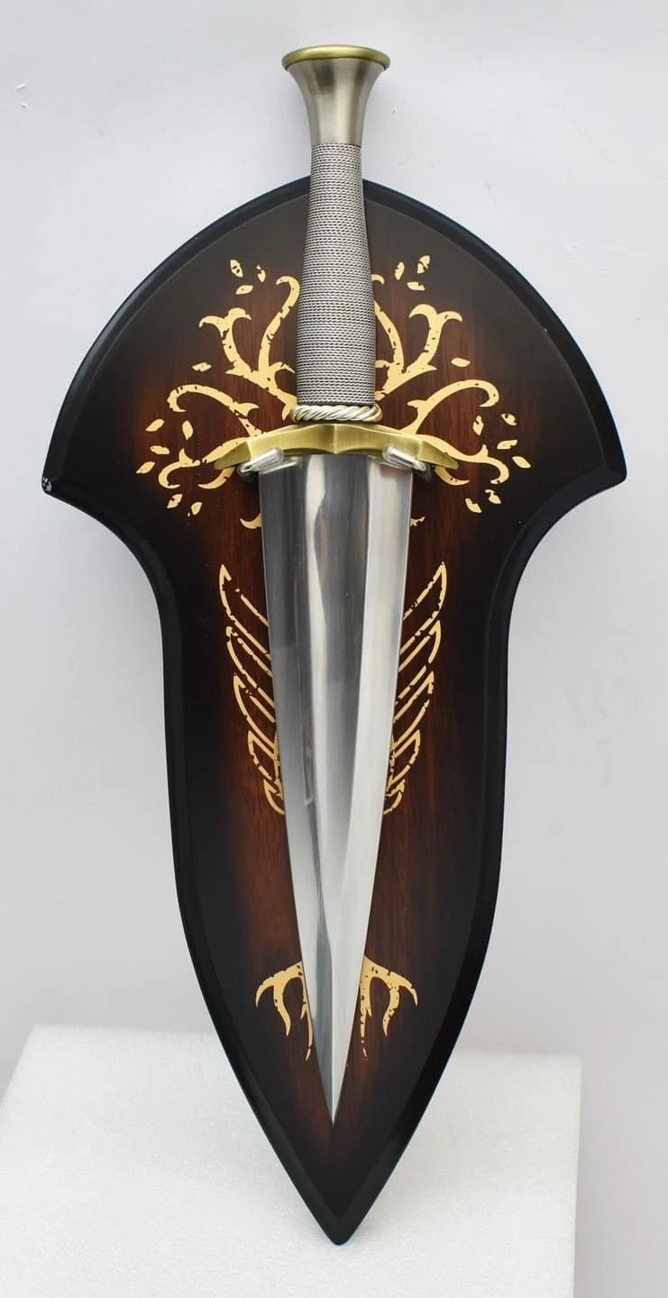 Experience the Valor of Boromir with the Lord of the Rings Dagger! Immerse yourself in the epic world of Middle-earth with this intricately crafted replica of the dagger wielded by Boromir in "The Lord of the Rings" trilogy. This dagger is not just a tribute to the legendary warrior but also an impressive collectible for fans of the fantasy saga. Exquisite Craftsmanship: The Boromir Dagger is masterfully crafted to preserve the authenticity and beauty of the original. Its blade is made of high-quality steel and adorned with intricate engravings that highlight the history and significance of this legendary piece. The handle is ergonomically shaped and finished with noble materials to ensure a comfortable and secure grip. Perfect for Display: Included is an elegant wall mount that allows you to stylishly showcase the Boromir Dagger in your home, office, or collector's room. Display your passion for the world of Middle-earth and impress your friends and family with this impressive piece. Technical Specifications: Exact technical specifications, including overall length, blade length, handle length, weight, blade, and handle materials, will be provided as soon as they are available. Details: Overall Length: 19-5/8" Blade Length: 15-3/4" Blade Thickness: 3/16" This sword is an official item produced by United Cutlery under the licence of New Line Cinema!