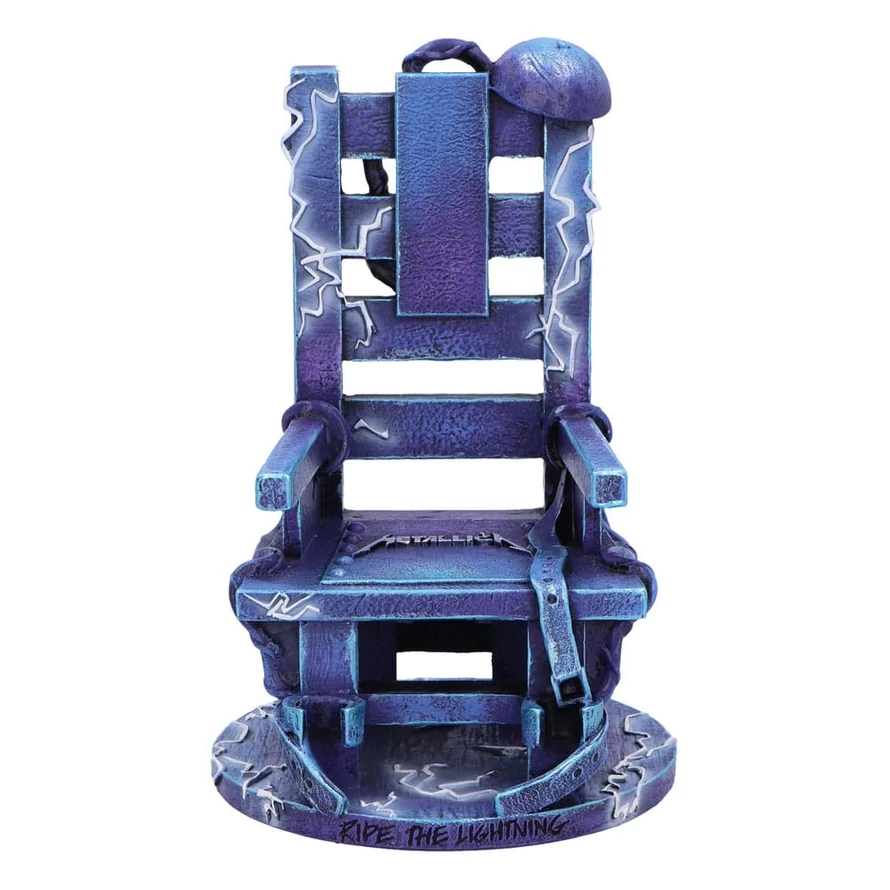 "Unleash your inner rocker with the Officially Licensed Metallica Ride the Lightning chair ornament, a stunning tribute to the legendary band's iconic second studio album. This unique piece features a striking blue electric chair adorned with the bold Metallica logo at its center, surrounded by intricate white lines of electricity. Crafted from high-quality resin and meticulously hand-painted, this ornament captures the essence of Metallica's electrifying energy and makes a bold statement in any space. Whether you're a dedicated Metallica fan, a lover of heavy metal music, or someone who appreciates gothic and horror-themed decor, this ornament is the perfect addition to your collection. It not only pays homage to Metallica's influential music but also serves as a striking decorative piece that sparks conversation and admiration. Its detailed craftsmanship and bold design make it a standout addition to any room, shelf, or display cabinet. Packaged in a Nemesis Now Metallica branded gift box, this Ride the Lightning ornament is ideal for gifting to fellow fans or for treating yourself. The box not only ensures safe storage and transport but also enhances the presentation, making it a perfect gift for any occasion. Elevate your decor and showcase your love for Metallica with this exceptional piece that celebrates one of the greatest albums in heavy metal history."