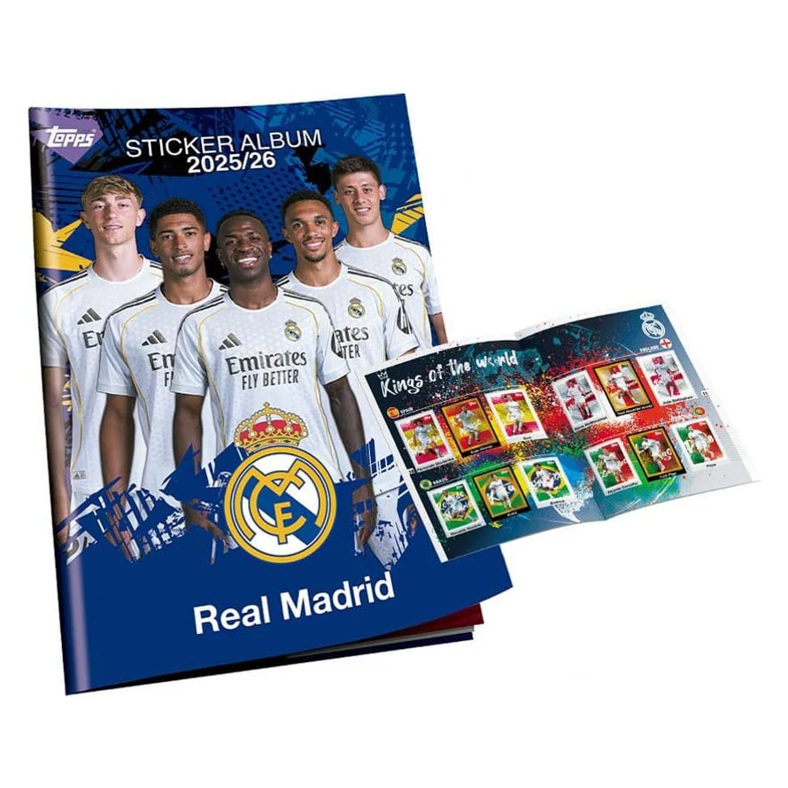 Topps presents the Real Madrid 2025/26 sticker album - an impressive tribute to the most successful club in football history. - 24-page album - Contains all 150 stickers (including 112 regular, 32 glitter, and 6 XL glitter stickers)