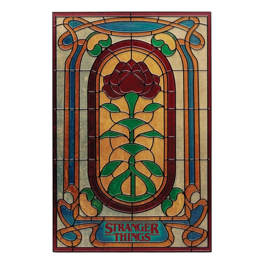 Creel House, abandoned in Hawkins shortly after being bought by the Creel family in 1959, became the site of one of the so-called 'curse' gates opened by Vecna. The front door of the house featured a stained glass window depicting a rose, and that window is recreated here in resin plaque form! Featuring both a desk stand, and wall-hanging hooks, the plaque is officially licensed and measures 200 x 131mm. - Officially licensed - Desk stand and wall-hanging hooks to reverse - Size 200 x 131mm