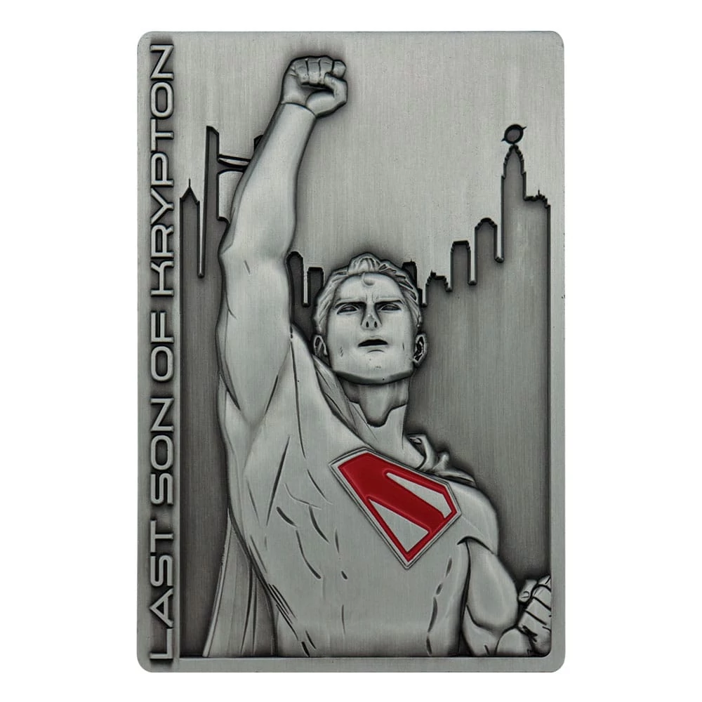 "Kal-El, sent to Earth as a baby by his father Jor-El as his planet Krypton was dying, grew up in Smallville, Kansas as Clark Kent, before moving to Metropolis and getting a job as a reporter at the Daily Planet, whilst moonlighting as the original superhero, Superman! This limited edition antique nickel ingot depicts David Corenswet's Superman to the front, and a cover of the Daily Planet to the reverse with the Superman shield in coloured red. Limited to 5,000 worldwide, each ingot is individually numbered and measures 89 x 59mm. - Limited to 5,000 - Individually numbered - Officially licensed - 89 x 59mm - Antique nickel plating"